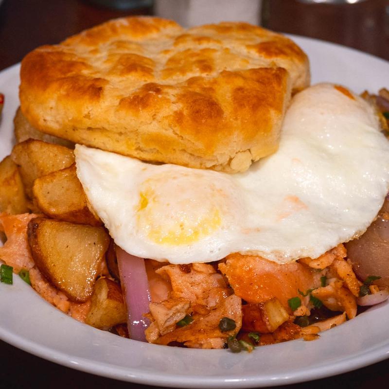 Lox, red onion, capers, herbed potato, scallions, eggs